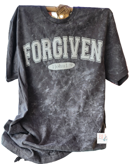 Forgiven 1 John 1:9 t-shirt, made with puff vinyl and distressed blended cotton and polyester T-shirts. Each t-shirt is individually distressed so no two shirts are exactly alike. Limited quantities available.
