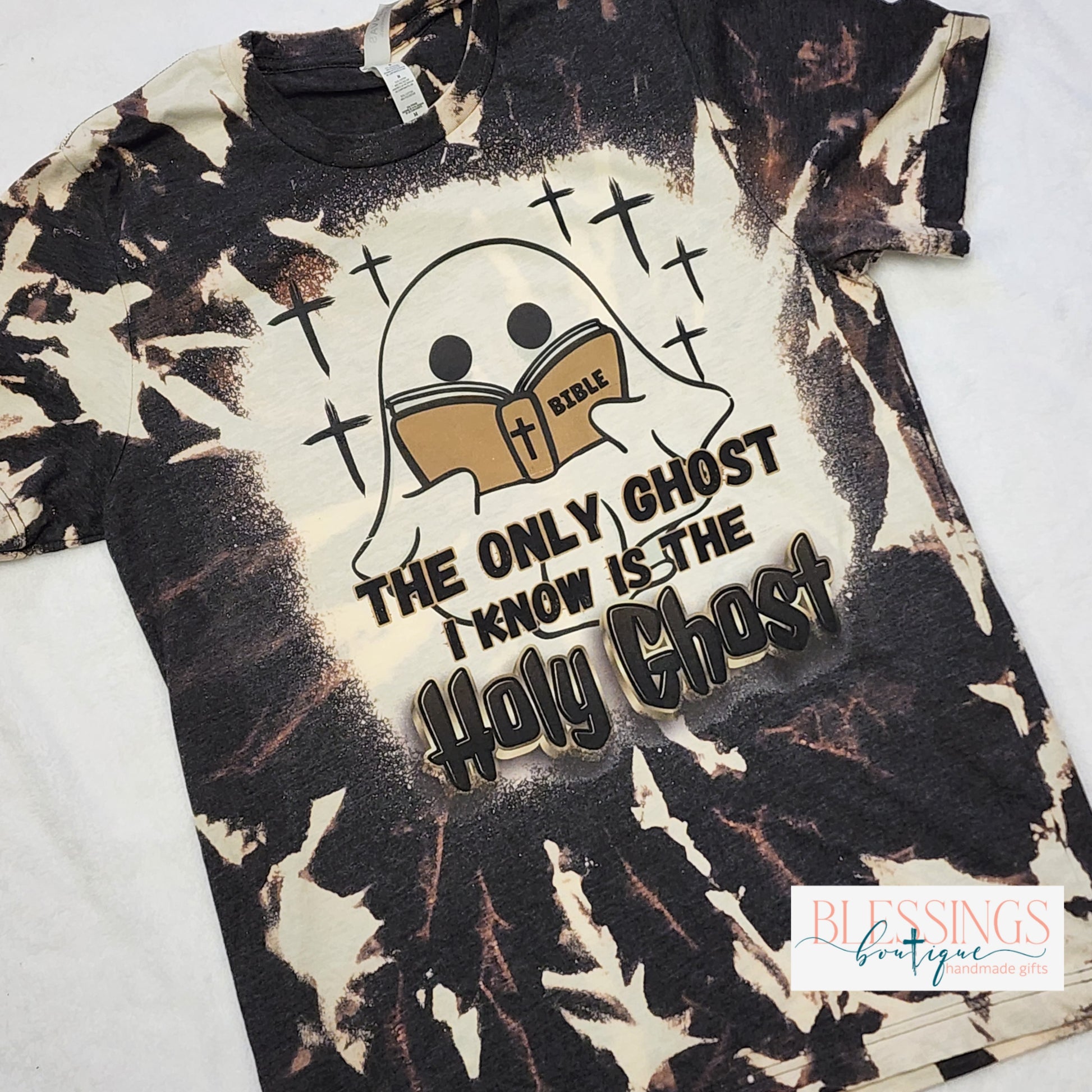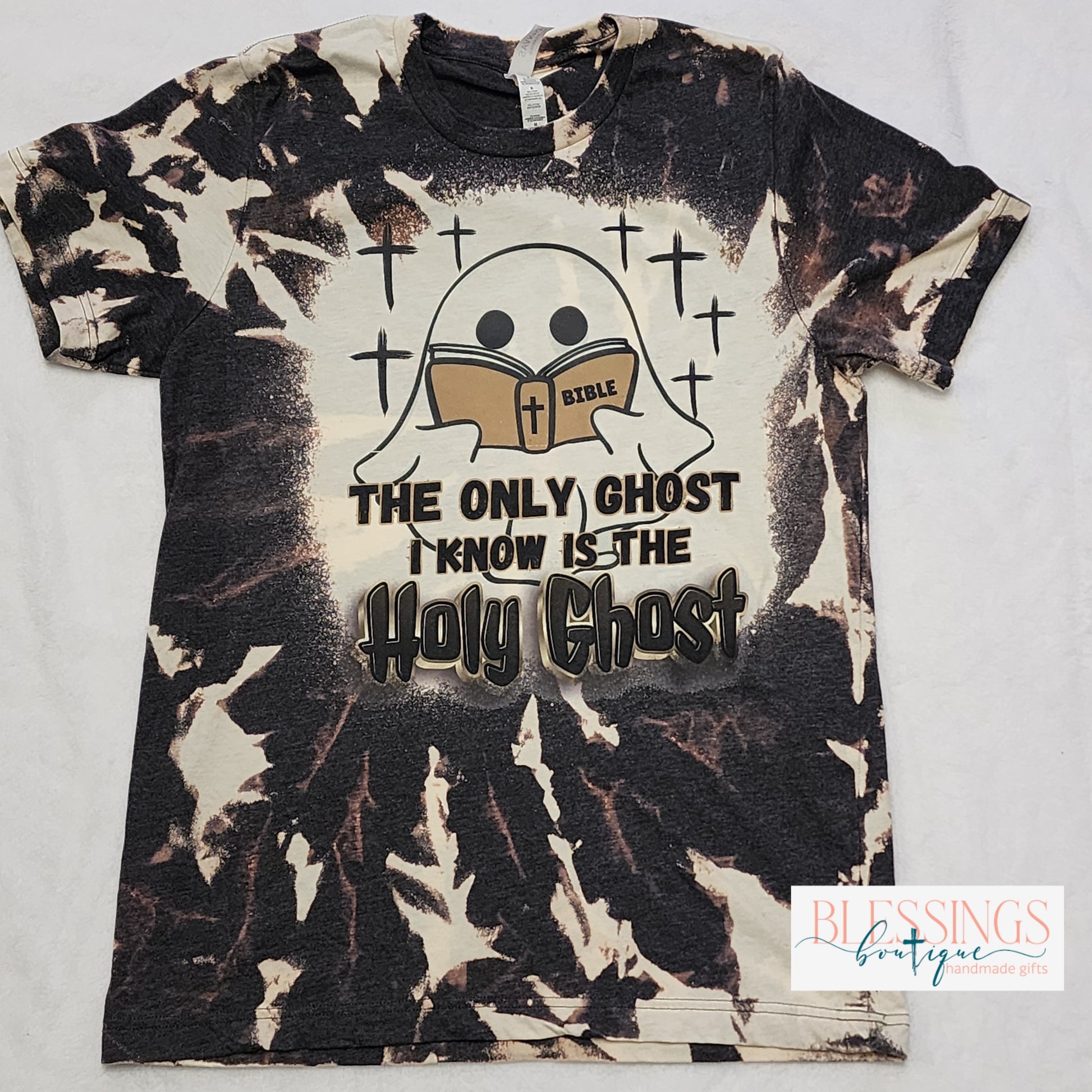 The Only Ghost I know is the Holy Ghost bleached t-shirt, made with blended cotton and polyester T-Shirts. Each t-shirt is individually bleached distressed and washed so no two shirts are exactly alike.