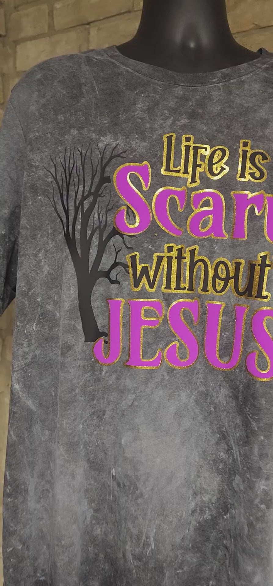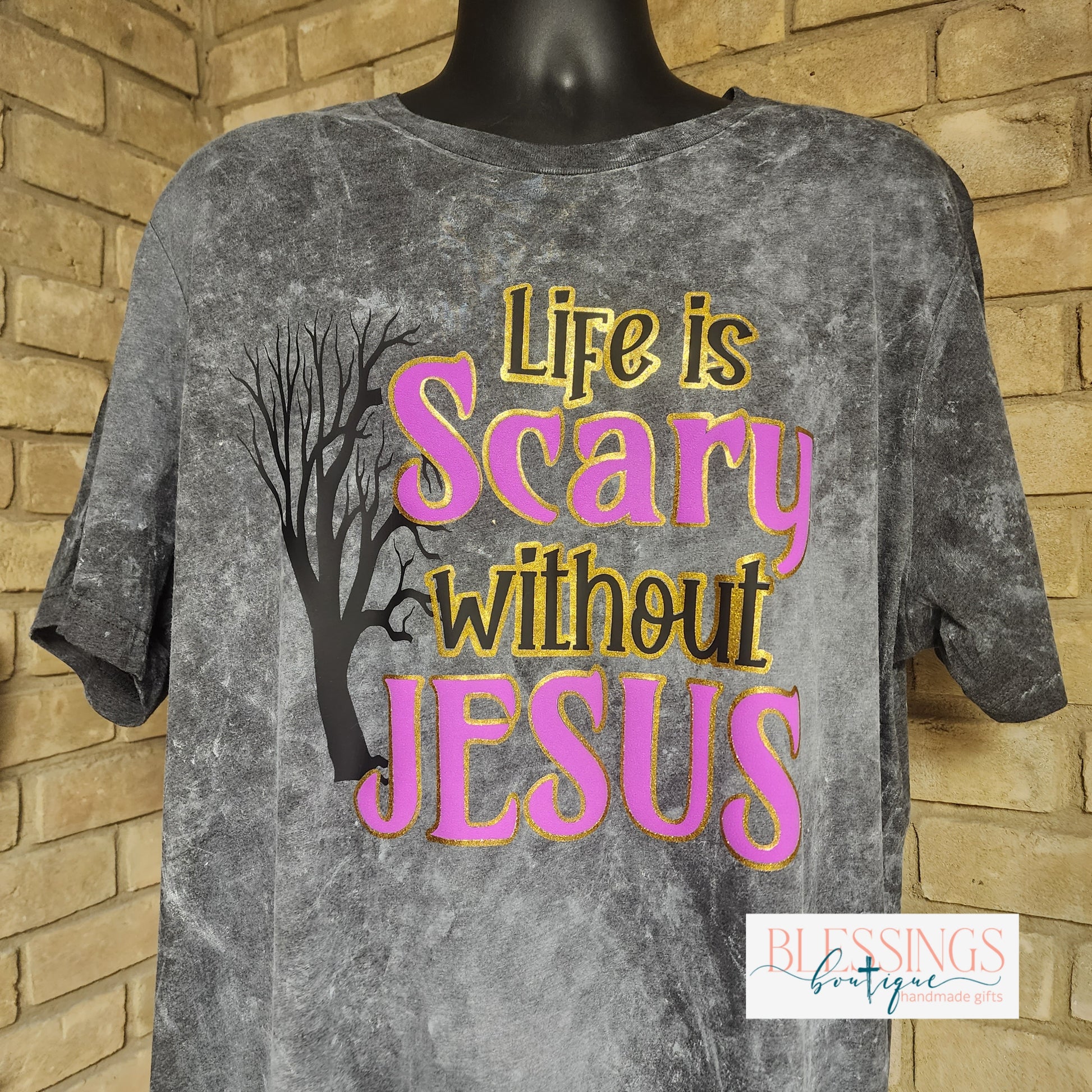 As seen on TikTok. Life is scary without Jesus t-shirt. Made with puff vinyl and distressed blended cotton and polyester T-shirts. Each t-shirt is individually distressed so no two shirts are exactly alike.