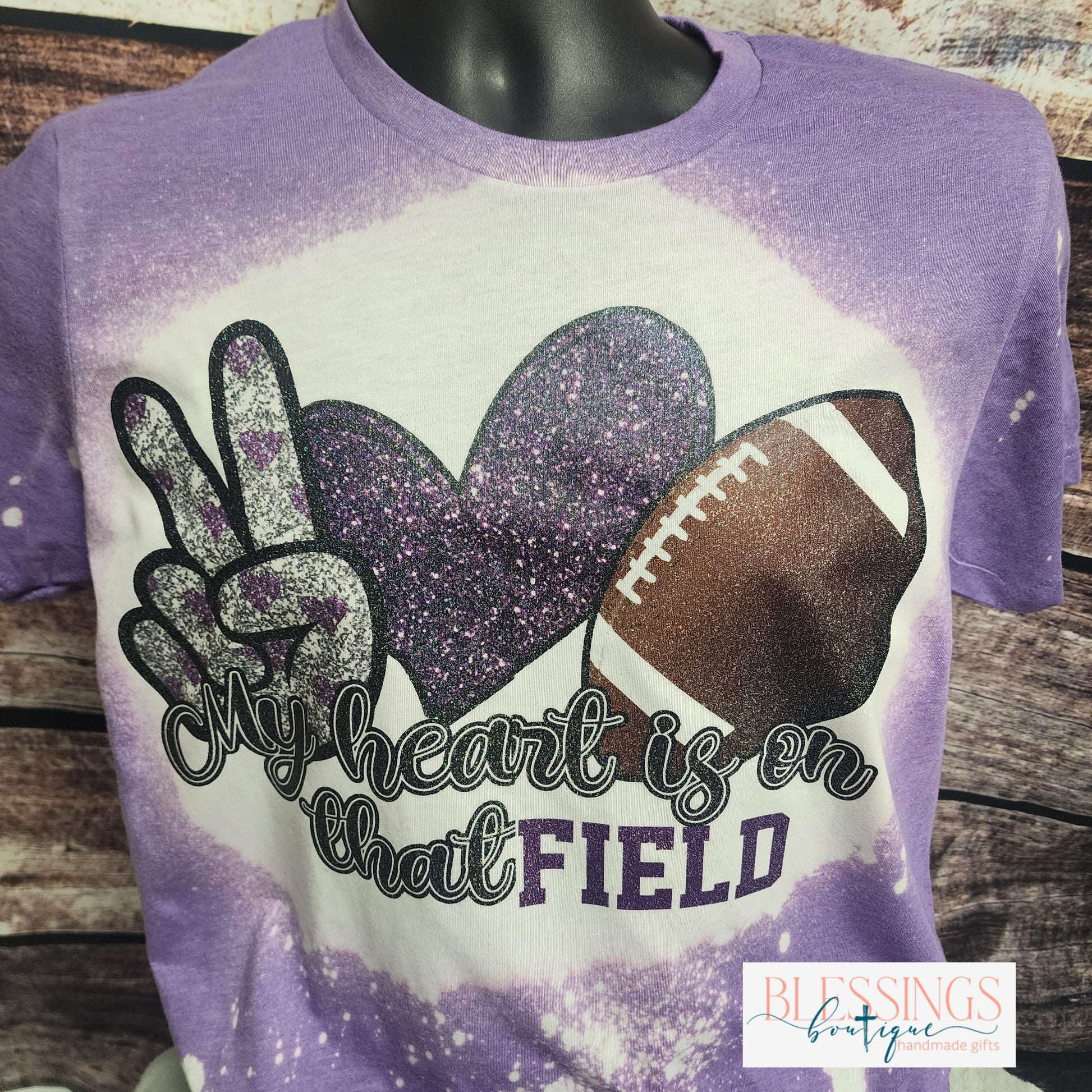 My Heart is on that Football Field T-shirt. Made with Bella Canvas unisex blended T-shirts. Each t-shirt is individually bleached distressed and washed so no two shirts are exactly alike. Features a glittery look that is sure to turn heads.