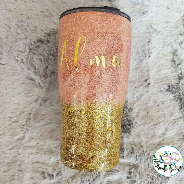 Two-color glitter tumbler includes your choice of glitter colors and includes your name or initial. Select your size and we will make your cup to order.